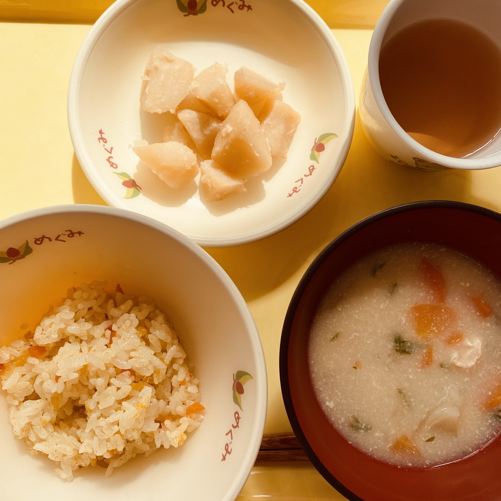 今日の給食は「カレーピラフ風混ぜごはん」です。