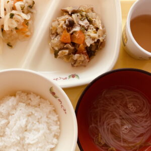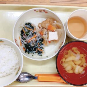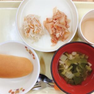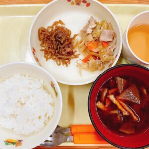 今日の給食は豚肉とキャベツの塩昆布炒めです。