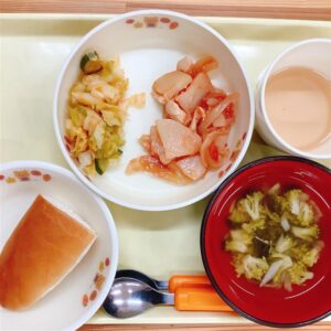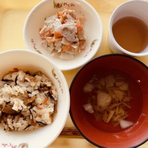 野菜スープには年中さんが収穫してくれたかぶの葉っぱが入っています。