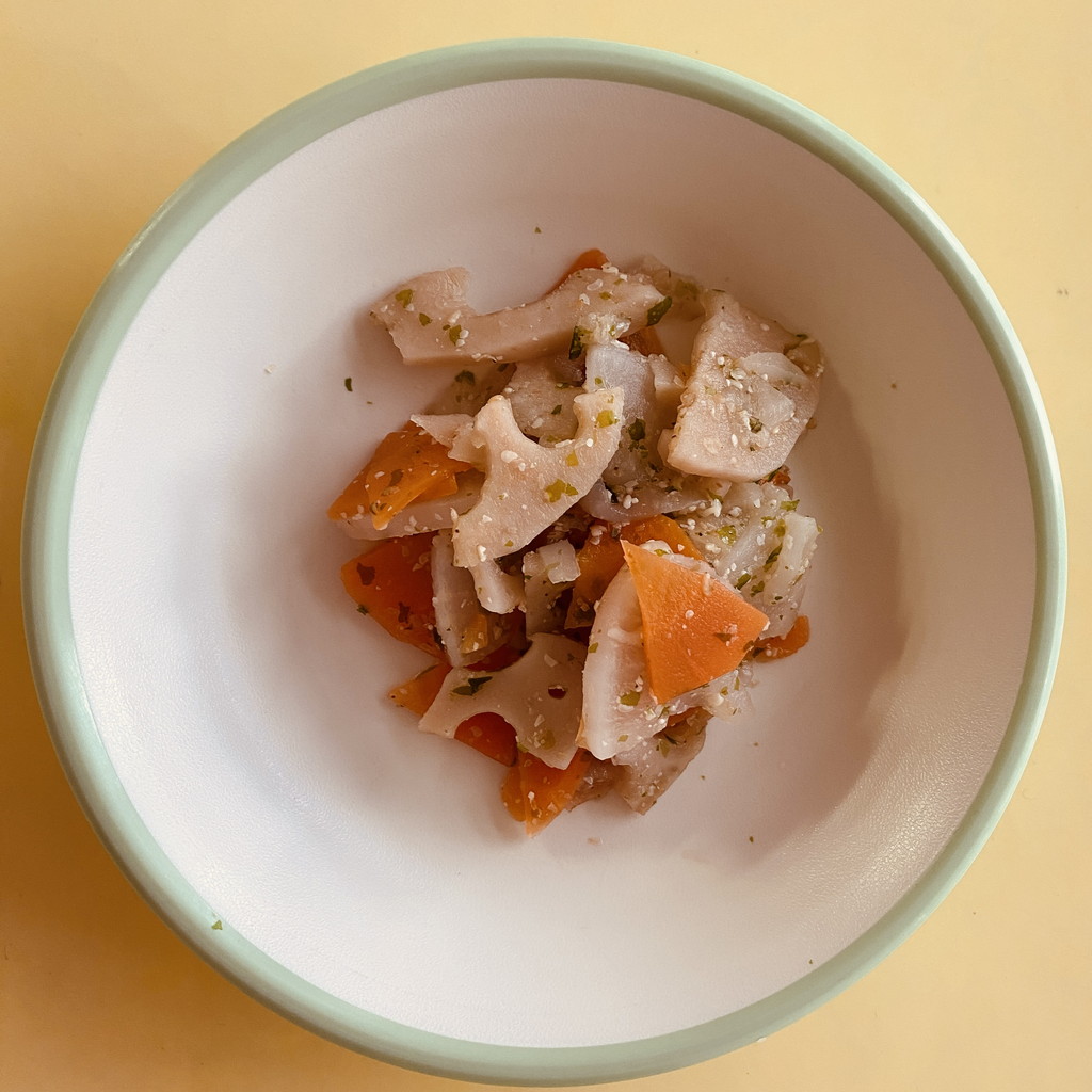 (卵アレルギー:マヨネーズ抜きの根菜青のりサラダ)
